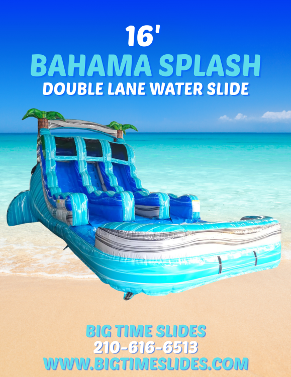 The 16’ Bahama Splash double lane water slide is perfect for all ages. It has 2 sliding lanes for double the fun. This slide is full of fun with its 16 ft. high climb and large drop into the huge pool.