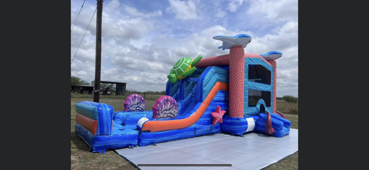 The Reef Racer XL bounce house w/slide combo is a customer favorite with its cool design. It offers coral print with inflated seashells, starfish, stingrays, tentacles, and an inflated turtle coming down the slide. This combo includes an XL bounce house with 2 basketball hoops inside, a climbing wall, and a dual lane slide. It can be used wet or dry. Great for birthday parties, school events, church festivals and more!
